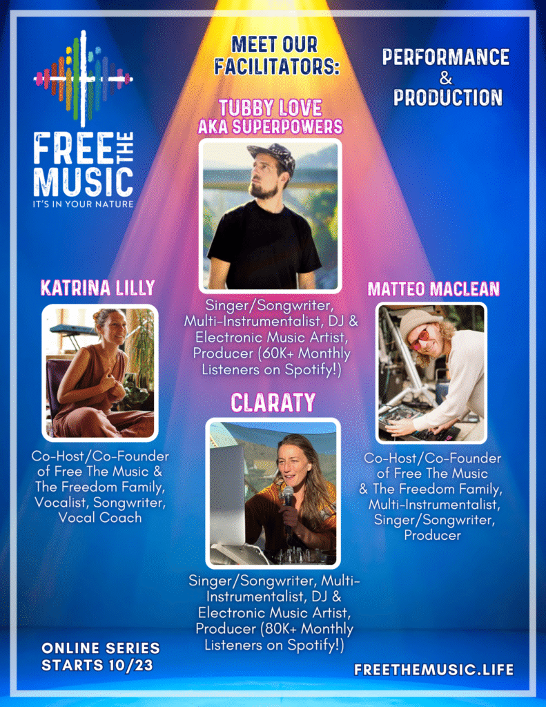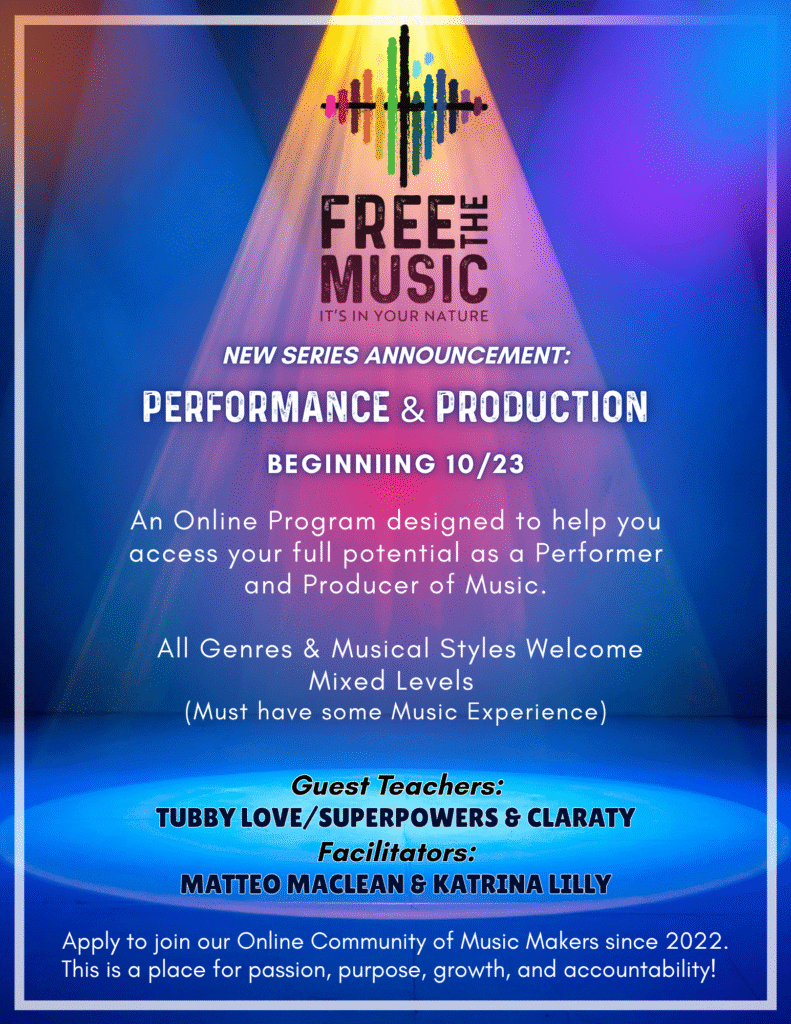 The Free The Music Mentorship Program is a personalized, heart-centered journey designed to empower musicians at every stage of their path, both in-person and online! This program blends hands-on guidance with spiritual and technical expertise to help you deepen your craft, develop your voice and instrument, and step into your role as a musician, teacher, or guide. With tailored mentorship, weekly group sessions, and access to a supportive community, you’ll gain the skills and confidence to create meaningful music, lead sacred spaces, and share your artistry with the world. This isn’t just about learning music—it’s about discovering your unique role in the transformative power of sound.